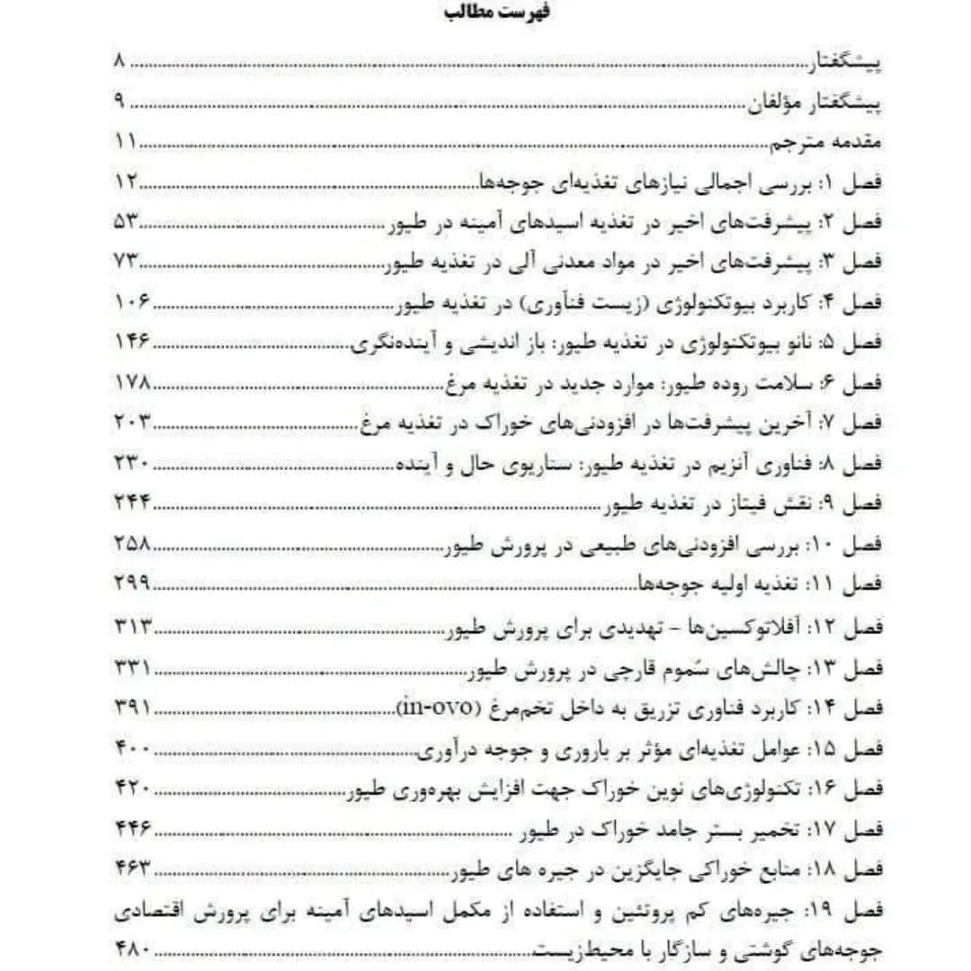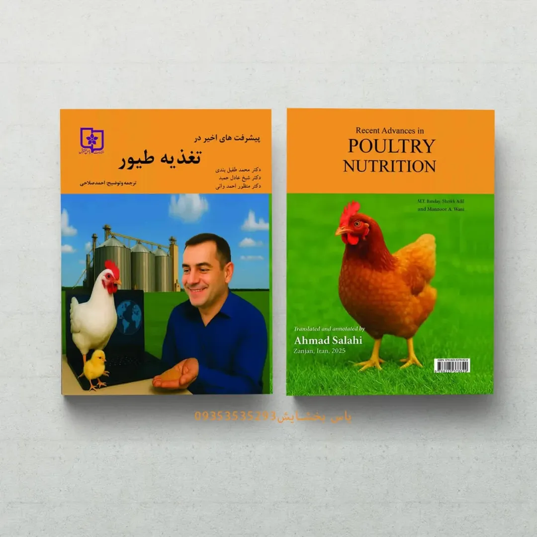 کتاب تغذیه طیور که در 20 فصل تالیف شده و با ترجمه و توضیح آقای احمد صلاحی در 527 صفحه منتشر شده است. بحث استفاده از موادمعدنی آلی، سلامت روده، نانوبیوتکنولوژی، فیتاز، آفلاتوکسینها، تکنولوژی های نوین خوراک، منابع خوراکی جایگزین، کاهش پروتئین در جیره ها و افزودنی های خوراکی و با توجه به تحقیقات جدید نگارش شده.