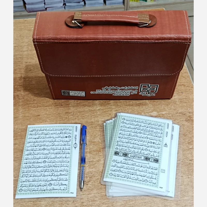 فلش کارت کامل قرآن کریم مخصوص حفاظ قطع 12*17 به همراه کیف چرمی بیش از 300 عدد کارت صفحات قرآن با روکش پلاستیکی و پرس خشک